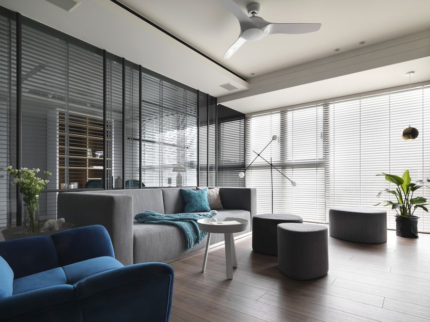 相较之下,立面则改以色泽浓郁的纯黑质材铺展,由入口壁柜延连而来的电视牆,在起居空间以内嵌型态作为摆设檯面,另外亦扩展侧向视觉感受;设计师双重运用壁柜与牆体落差形塑外推空间感,搭配深色有利于吸收光线的物理定律,令主牆展现深邃宽广的画面感,转化原先狭长型的场域条件限制。而沙发后方的立面巧妙化用落地清玻搭载百叶帘,让客厅与书房的户外日照适时汇聚,为生活自然拂上透亮光感;而铁建框构出的大小视窗,亦使简单纯淨的清玻璃产生趣味变化,更成为大面积玻璃的安全收边,完备通透与稳固兼具的视觉印象。