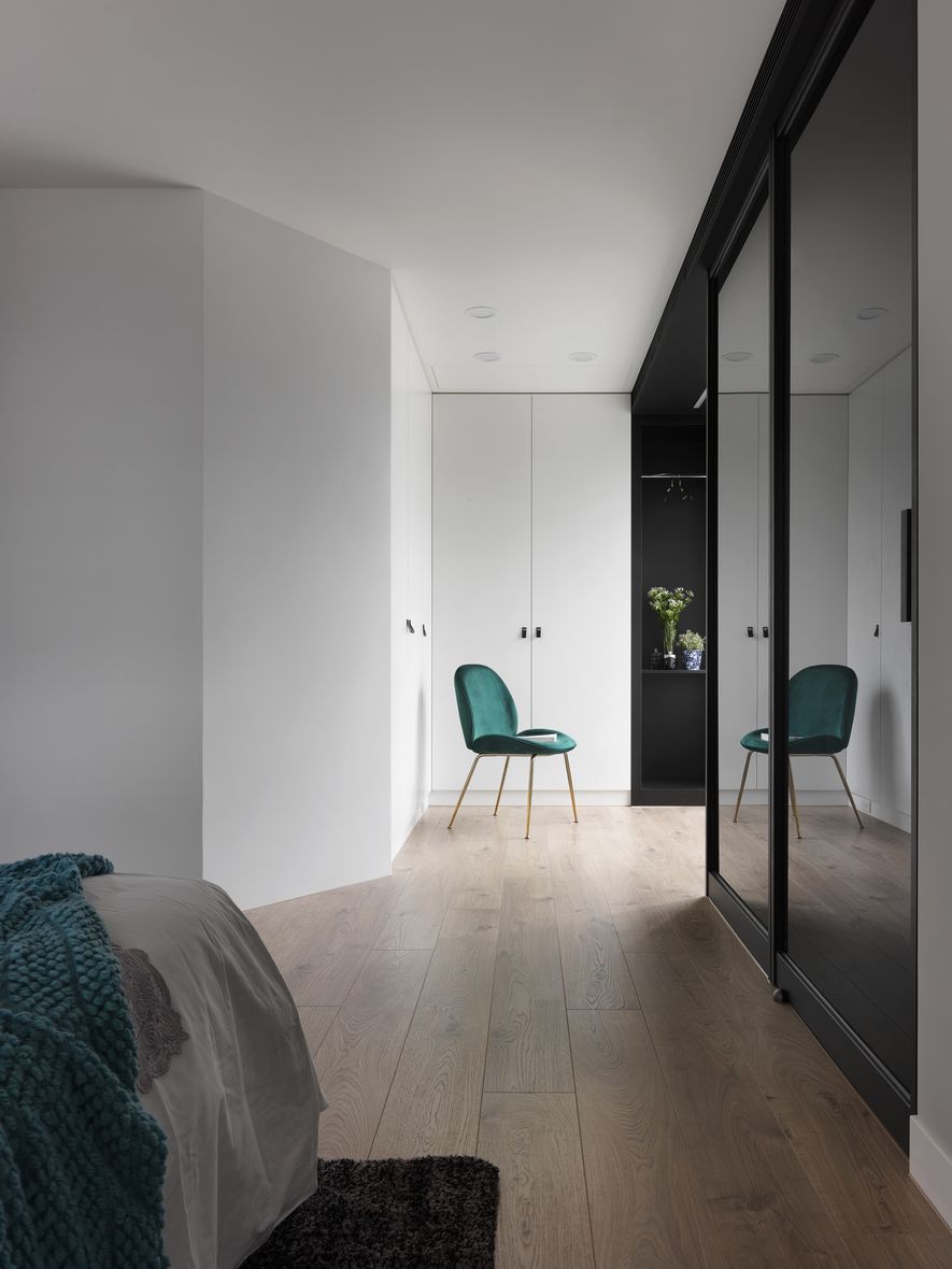 藉由纯白地坪的指引来到卧室,设计师在房间入口即巧藏心思——将划分场域的材质拼接线稍微转向,形成醒目的斜角箭头,像是暗示量体核心的隐密指路牌。房室全区採用木质地坪奠定温暖的空间氛围,卧床上方的天花板更一气呵成地接续木作手法,使居住者犹如卧于树洞般倍感安稳。衣柜则呼应公领域的立面概念,于柜体门片装设黑玻,并将如此的色彩意绪延伸至多功能区,化作包容自然景致的雅緻画框,而边侧空间亦未閒置,规划为隐而不彰的展品壁龛,让视觉穿透实体限制,将内外的动静美景同座收纳。而多功能区块的立面,主要採用纯白质材形塑出鲜明的转折线,当日照拂过,犹如立体感强烈的摺纸作品,藉由折线繫留光影走过的痕迹,为温馨的睡眠场域优雅收笔。