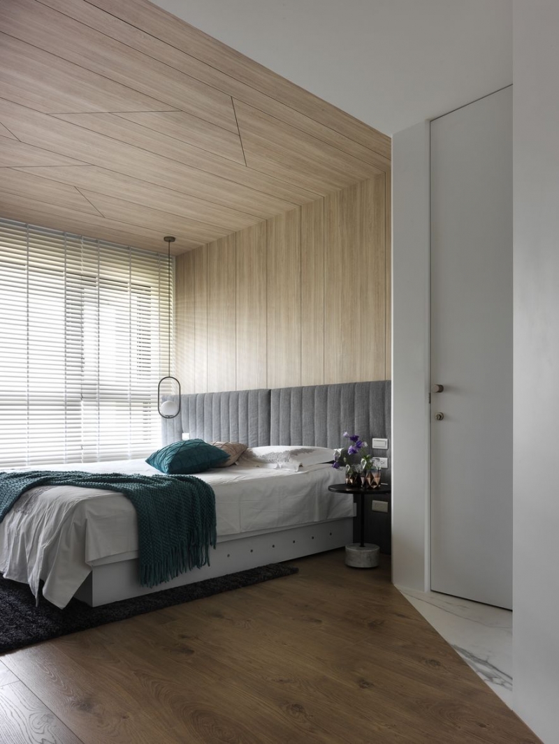 藉由純白地坪的指引來到臥室,設計師在房間入口即巧藏心思——將劃分場域的材質拼接線稍微轉向,形成醒目的斜角箭頭,像是暗示量體核心的隱密指路牌。房室全區採用木質地坪奠定溫暖的空間氛圍,臥床上方的天花板更一氣呵成地接續木作手法,使居住者猶如臥於樹洞般倍感安穩。衣櫃則呼應公領域的立面概念,於櫃體門片裝設黑玻,並將如此的色彩意緒延伸至多功能區,化作包容自然景致的雅緻畫框,而邊側空間亦未閒置,規劃為隱而不彰的展品壁龕,讓視覺穿透實體限制,將內外的動靜美景同座收納。而多功能區塊的立面,主要採用純白質材形塑出鮮明的轉折線,當日照拂過,猶如立體感強烈的摺紙作品,藉由折線繫留光影走過的痕跡,為溫馨的睡眠場域優雅收筆。